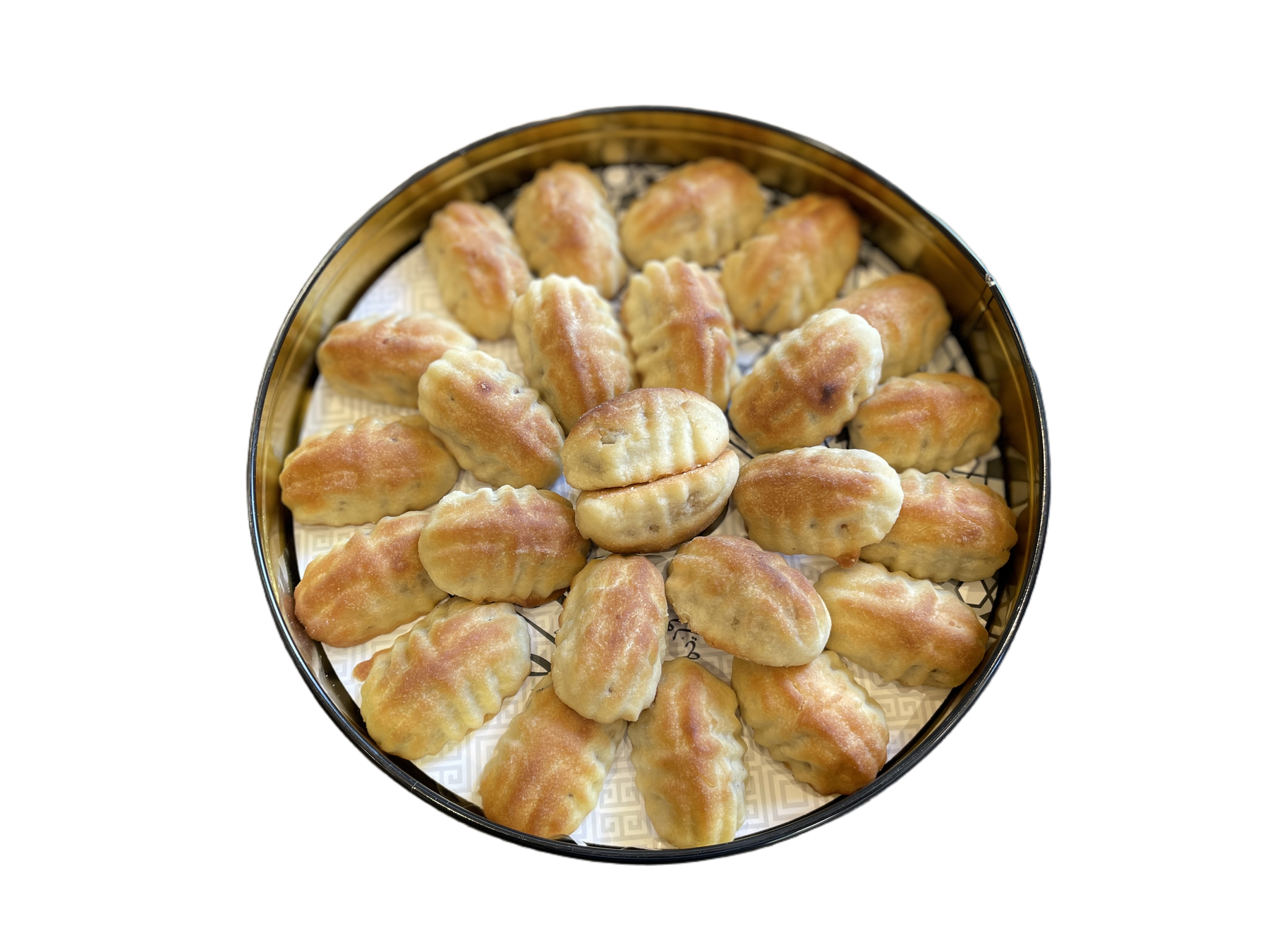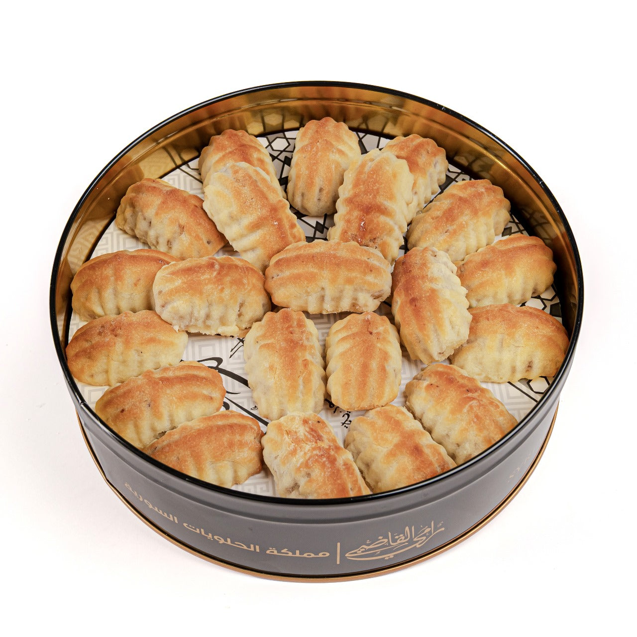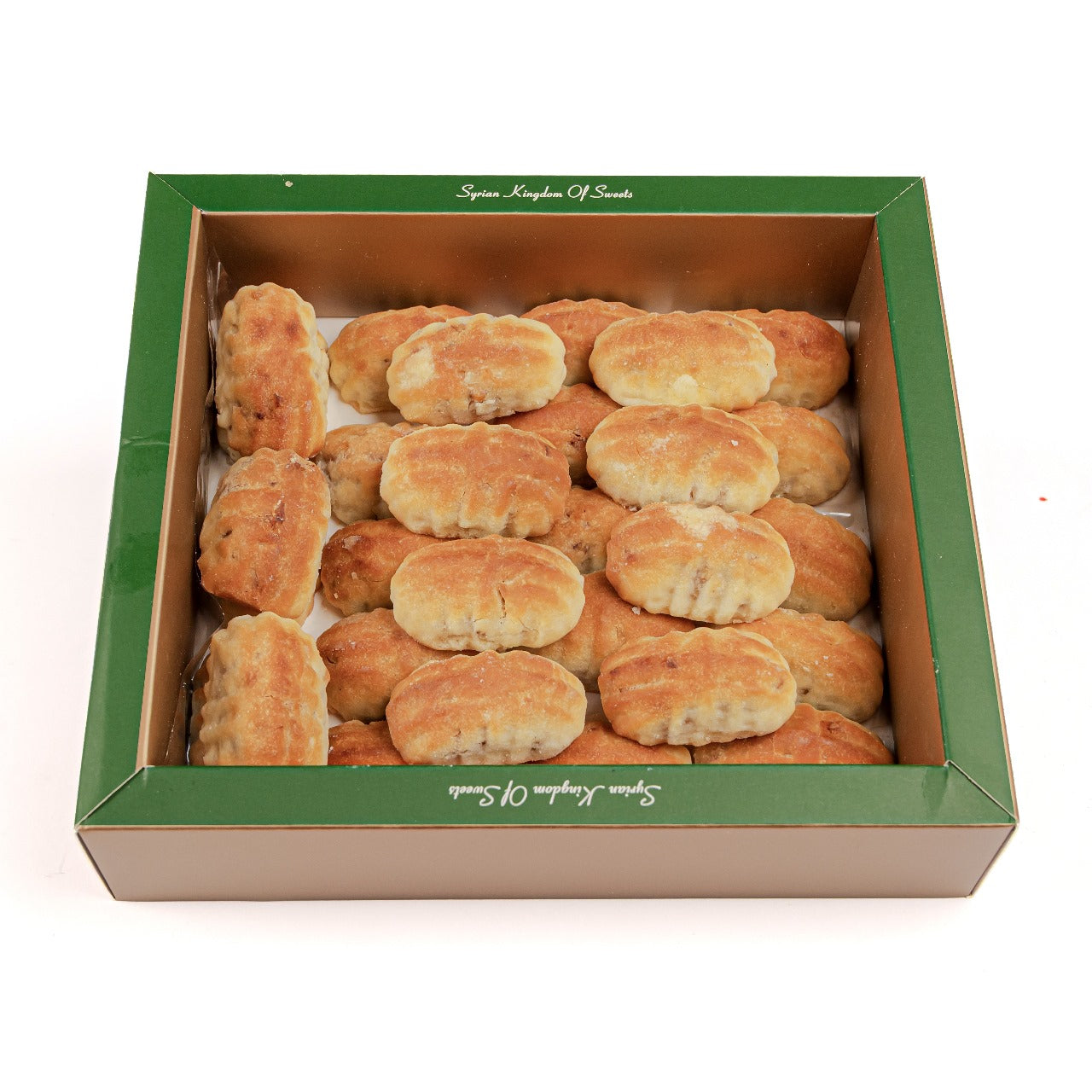 يُصنع هذا المعمول من عجينة السمن العربي النقي، تعجن بدقة وتُنكّه بماء الزهر والورد، لتكون هشة، ناعمة، تذوب كالحلم على أطراف اللسان. في قلبها تختبئ حشوة الجوز الفاخرة، الممزوجة برشة من السكر ولمسة من القرفة، فتمنحك نكهة دافئة متوازنة، تنبض بالروح الشامية.